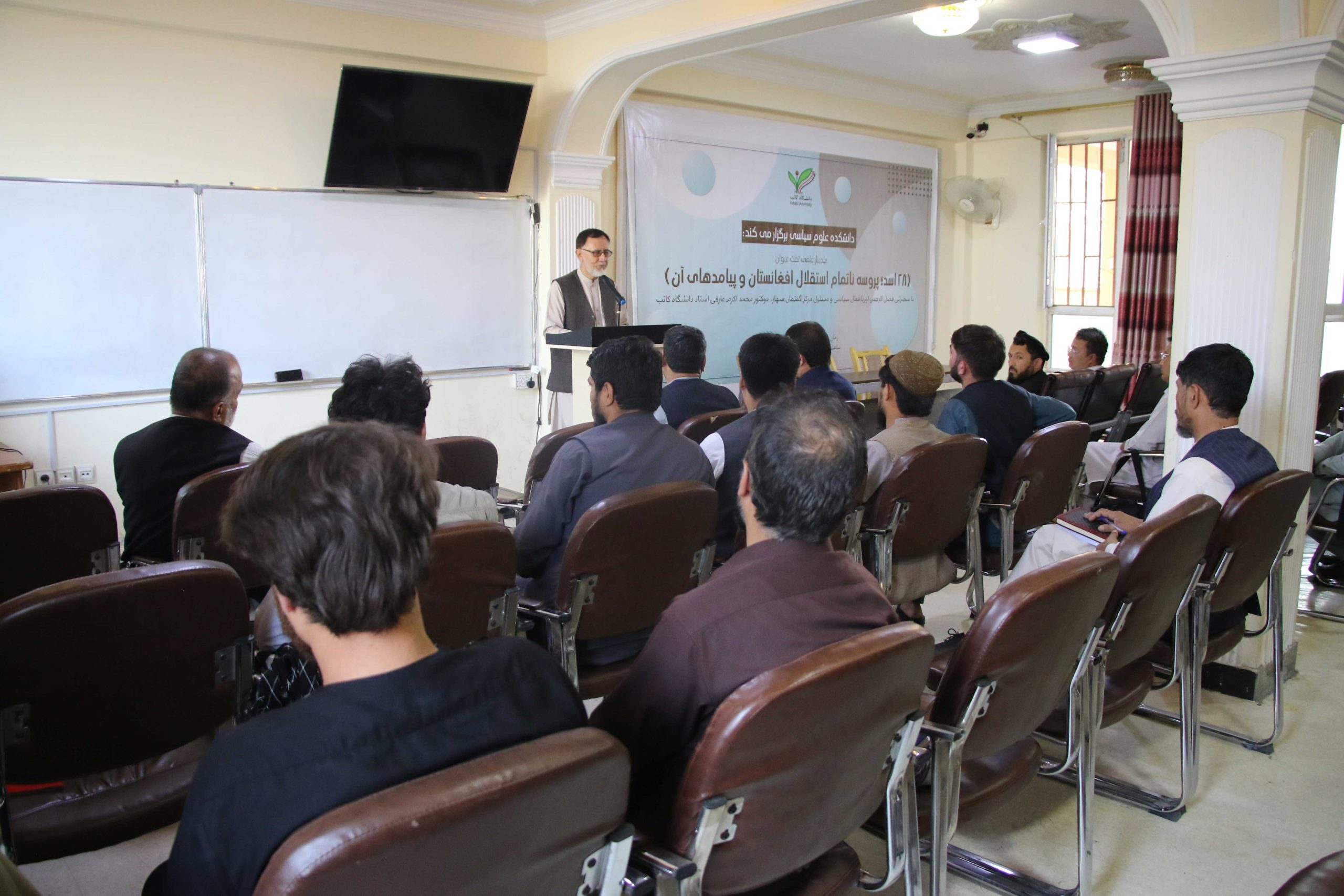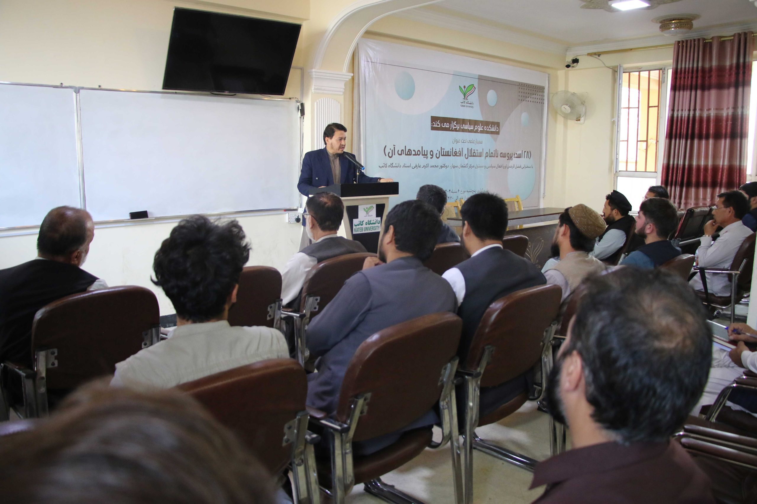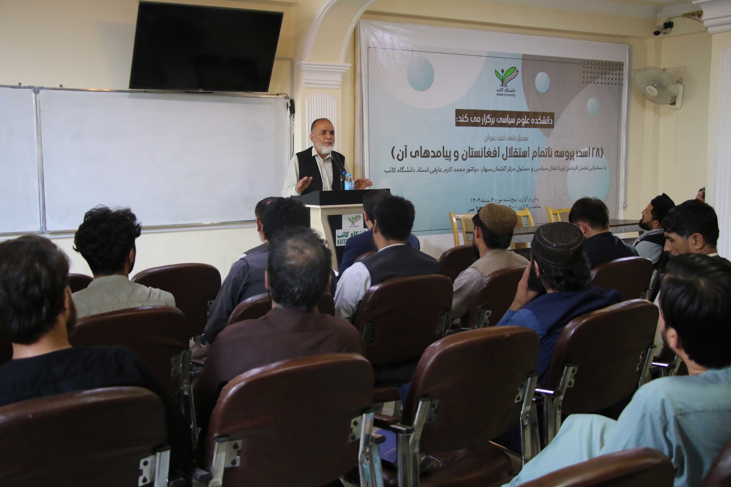 دانشکده علوم سیاسی بعد از ظهر روز پنجشنبه تاریخ 6 سنبله 1404 سمیناری تحت عنوان «28 اسد؛ پروسه ناتمام استقلال افغانستان و پیامدهای آن» با شرکت استادان و محصلان ماستری و لیسانس روابط  بین الملل در سالن اجتماعات ساختمان کاتب برگزار نمود. در این سمینار دو سخنران؛ یکی از خارج دانشگاه و دیگری از استادان دانشکده علوم سیاسی کاتب به ایراد سخن پرداختند. در ابتدا آقای شکر الله سروری یکی از کارمندان کاتب با تلاوت آیاتی از قرآن کریم برنامه را آغاز نمود آنگا آقای مرتضی مشرفی یکی از محصلان ماستری روابط بین الملل بعنوان مجری و دبیر علمی سمینار در جایگاه قرار گرفته و به  مهمانان خیر مقدم گفت. آقای مشرفی پس از اتمام سخنان افتتاحیه خویش از دکتور محمد اکرم عارفی از استادان دانشکده علوم سیاسی دانشگاه کاتب برای ارایه سخنانش به جایگاه دعوت به عمل آورد. دکتور محمد اکرم عارفی در جایگاه قرار گرفته و ضمن تقدیم احترام به مهمانان و شرکت کنندگان، سخنان خویش را در محورهای ذیل ارایه نمود: